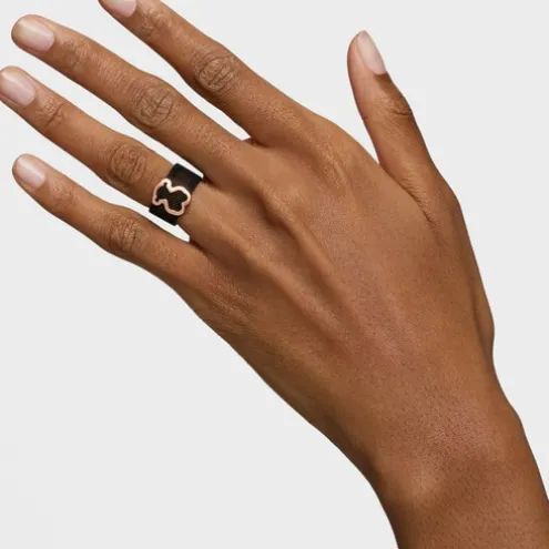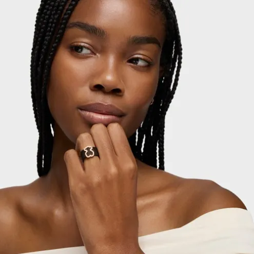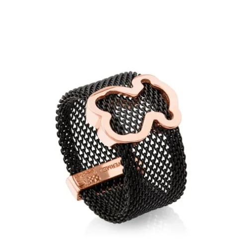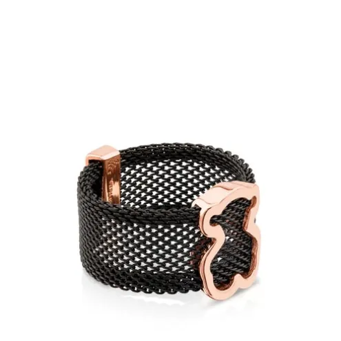 Anel TOUS Icon Mesh em aço IP preto com motivo em prata vermeil rosa. Largura: 1 cm. Motivo: 1,35×1,11 cm. Vermeil: Prata de primeira lei banhada a ouro rosa de 18 quilates.