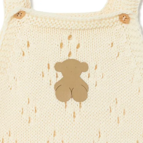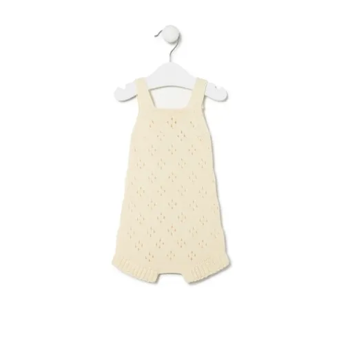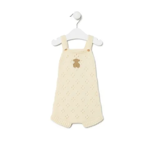 Macacão curto de bebé TOUS Baby de alças com Urso aplicado por baixo do decote. Confecionado em malha aberta de algodão de alta qualidade sem costuras, evitando possíveis atritos na delicada pele do bebé. Fecho com botões de madeira de oliveira. Composição: 100% algodão. Cor: crua. Fabricado em Espanha.
