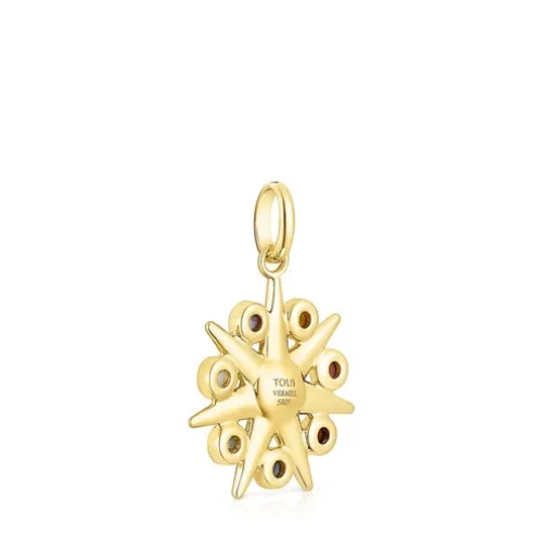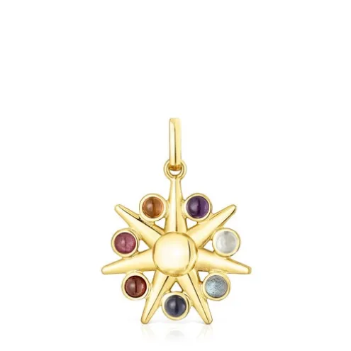 Pingente TOUS Magic Nature sol em prata vermeil com labradorite, iolita, prehnite, ametista, safira laranja, rubi tratado e granada laranja de 3 x 2 mm. Tamanho do pingente: 20,7 mm. Este artigo não inclui a corrente. Prata de primeira lei revestida com ouro de 18 K com uma espessura de 3 a 5 micras e sem nenhum outro metal entre ambos. Técnica de produção: Fundição.